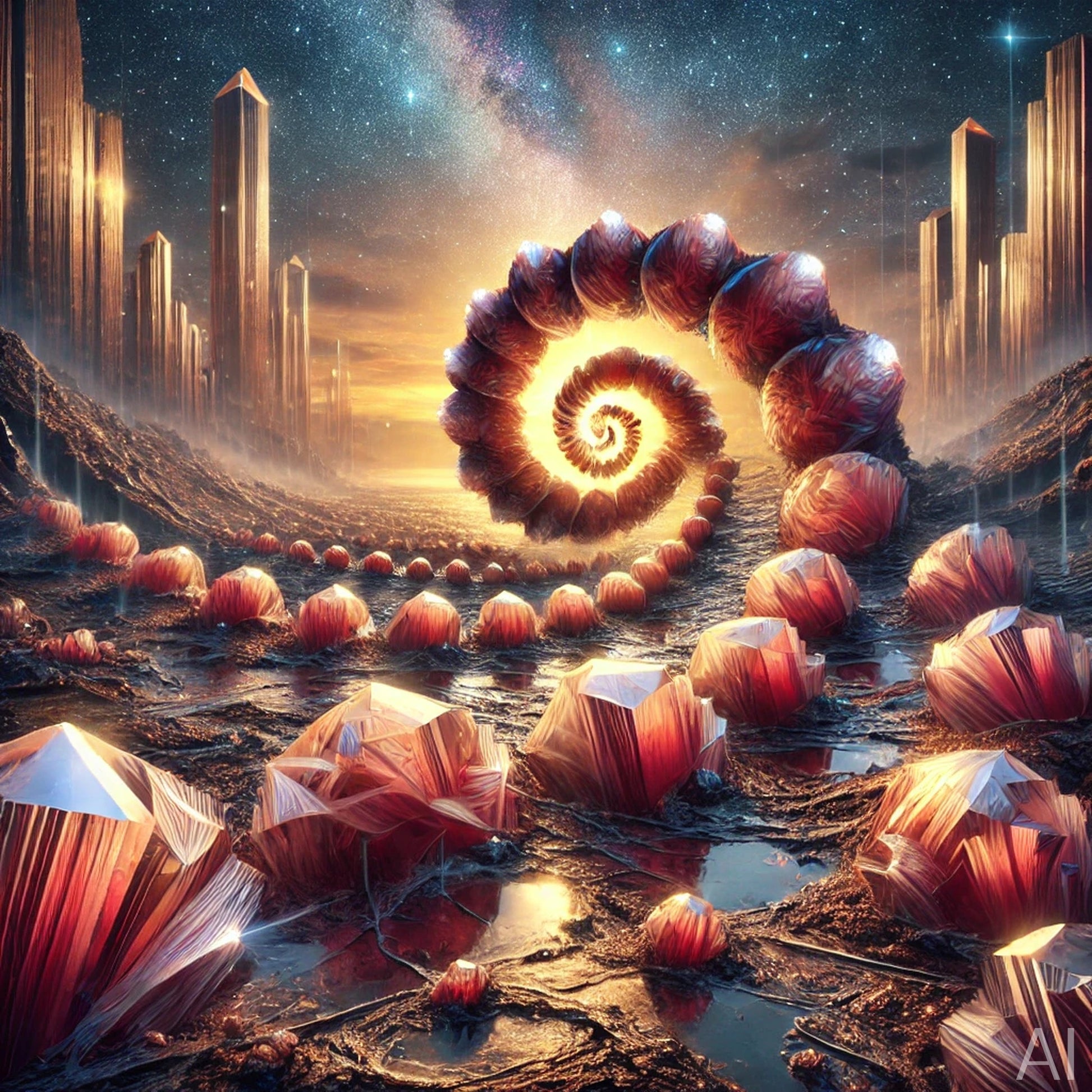 Explore breathtaking worlds where crystal formations rise from alien terrains. This 5-image digital art collection features surreal landscapes blending gemstone peaks, ethereal skies, and shimmering light effects—perfect for collectors of sci-fi, visionary, or fantasy-inspired decor.