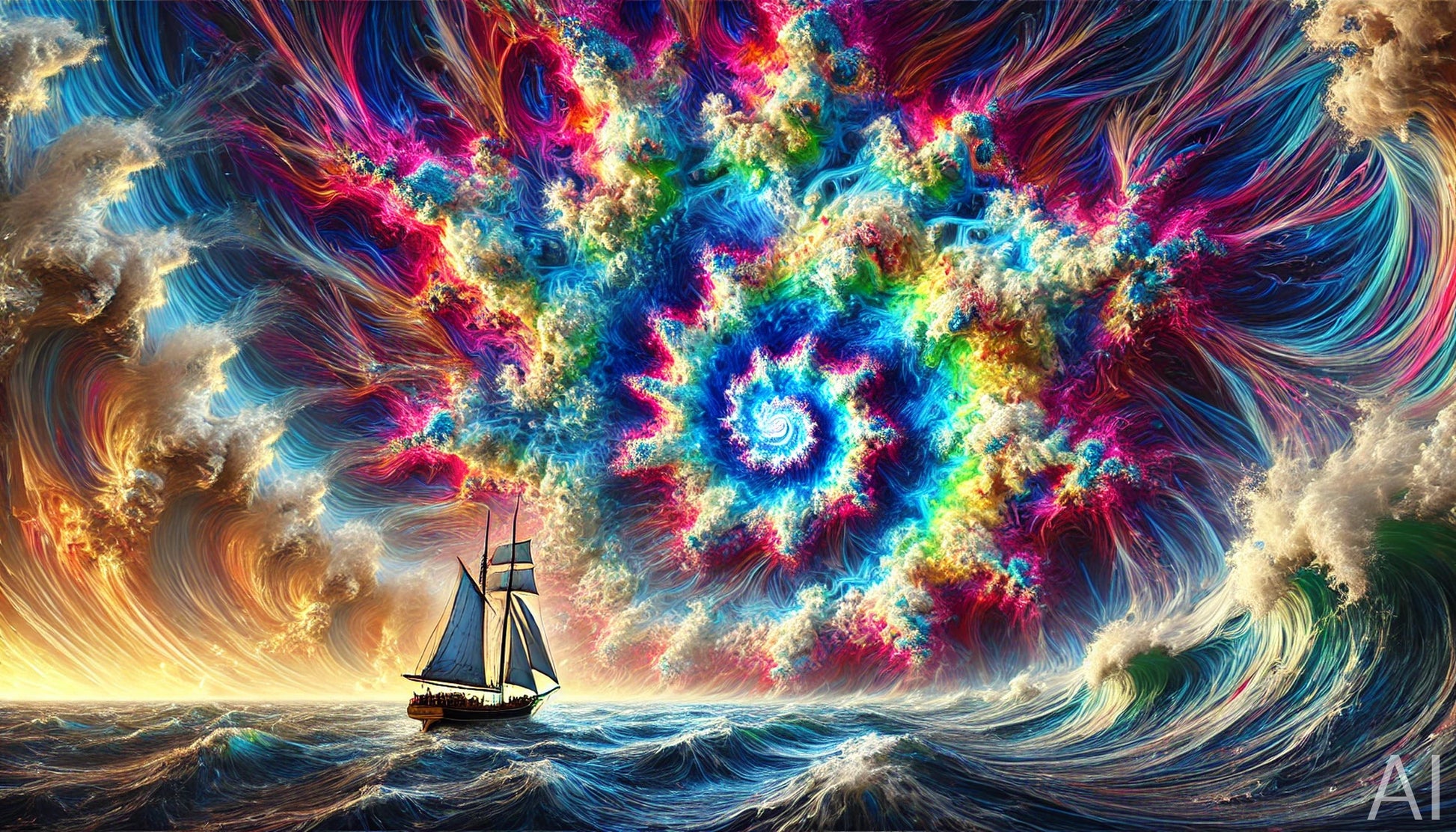 Enter the eye of the cosmic storm with this 5-image digital art collection. Each high-resolution piece captures the swirling power of a surreal maelstrom—where galaxies collide with ocean tempests in a dramatic fusion of chaos and color.